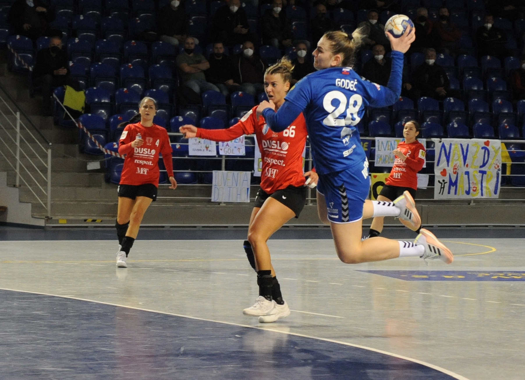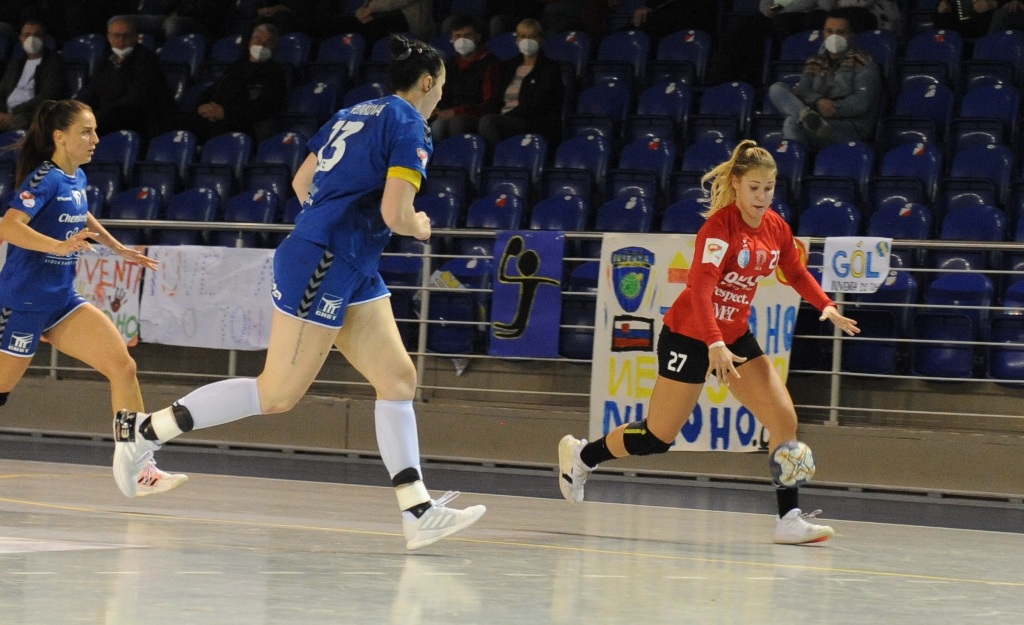 Zápas dvoch odvekých slovenských rivalov začal v jasnej dominancii domácej Iuventy. Tá v piatej minúte viedla po šnúre štyroch gólov 4:0. V týchto momentoch v bráne vynikala Mendesová, ktorá stihla vychytať v úvodnej päťminútovke štyri čisté šance Dusla. Jej spoluhráčky tak mohli naťahovať svoje vedenie. Keď Štefaniková dala v dvanástej minúte na 9:3, zobral si tréner Šale Peter Pčola svoj prvý oddychový čas. Ten Zemplínčanky nezastavil, keďže chvíľu na to upravila Bajčiová z pokutového hodu už na 11:3. Následne ale začala Šaľa sťahovať michalovský náskok a v 23. minúte už boli iba 15:12. Iuventa však kontrovala piatimi gólmi v rade a znova jej hráčky zobrali opraty zápasu do svojich rúk. Prvý polčas vyhrali 21:14 a pevným krokom tak kráčali k ďalšiemu víťazstvu.