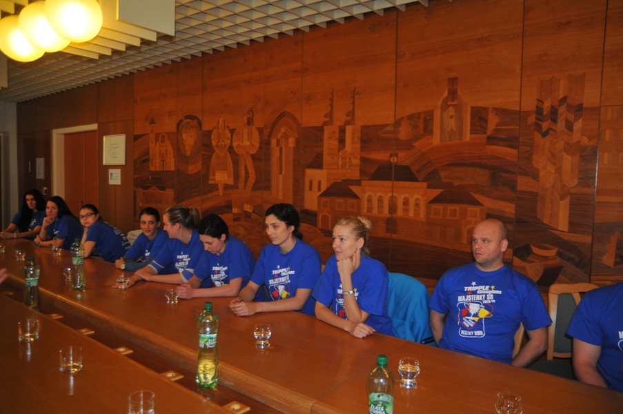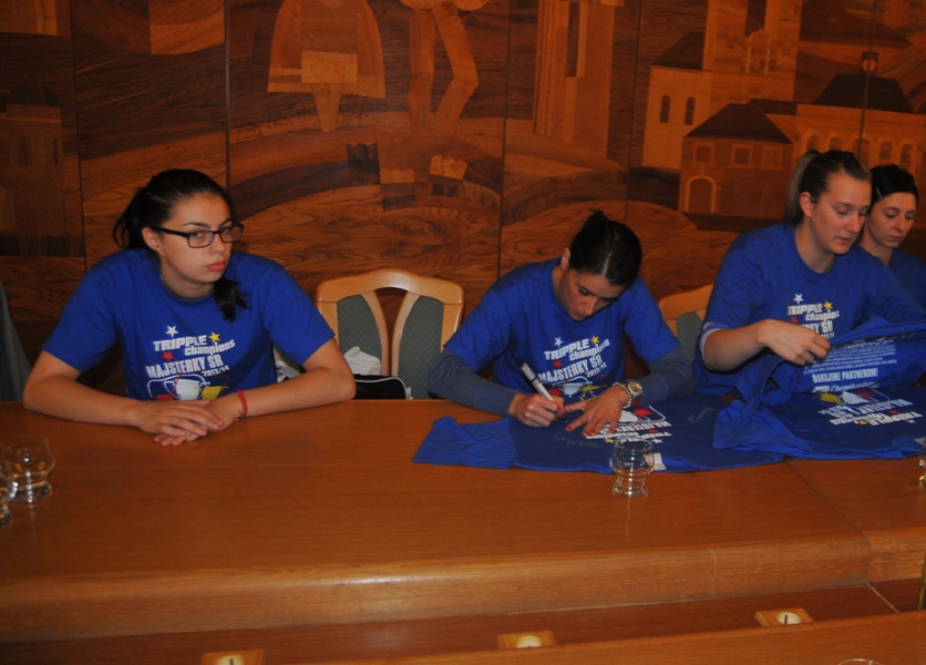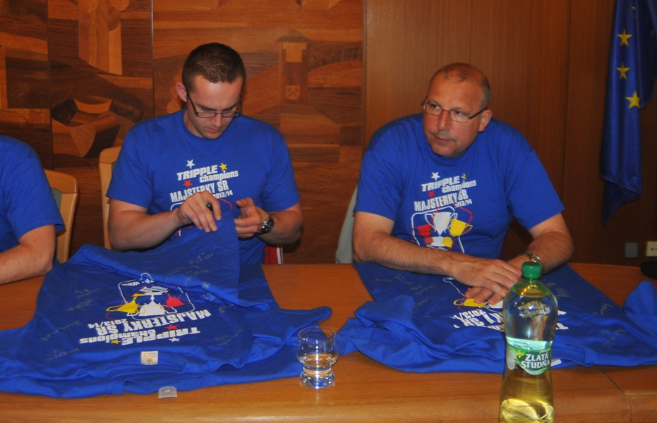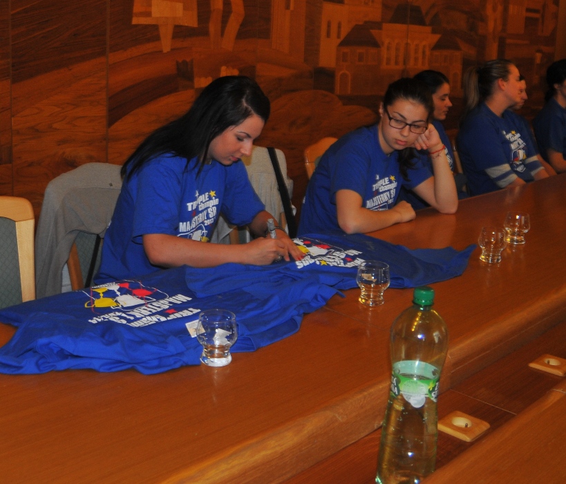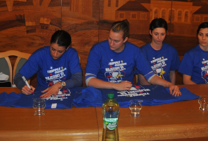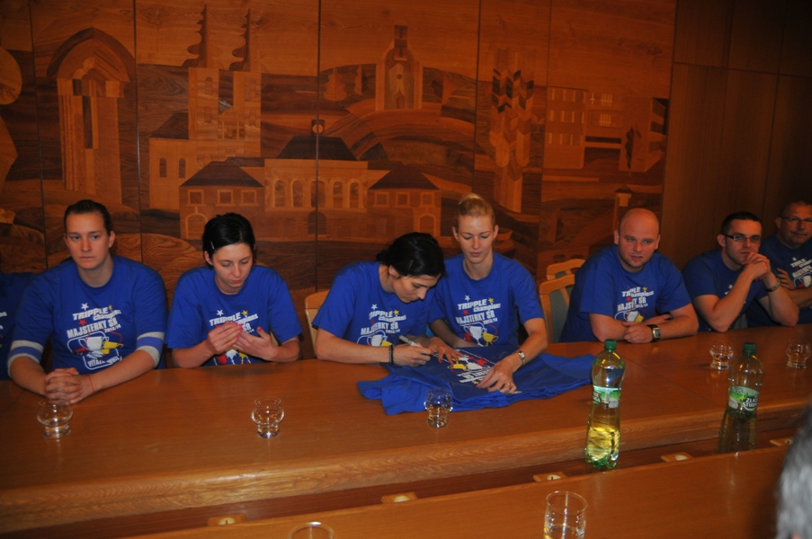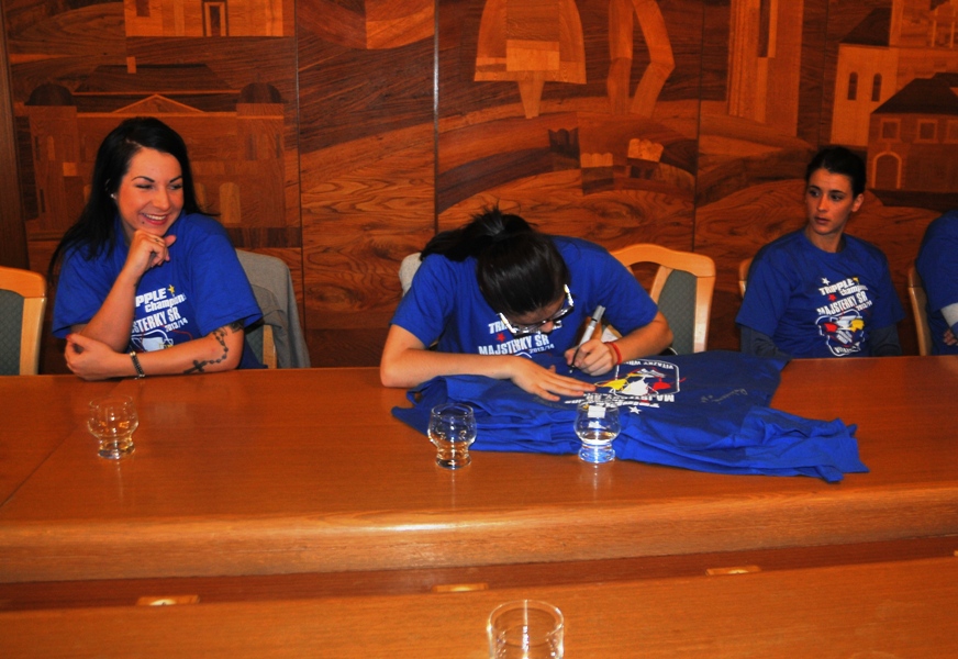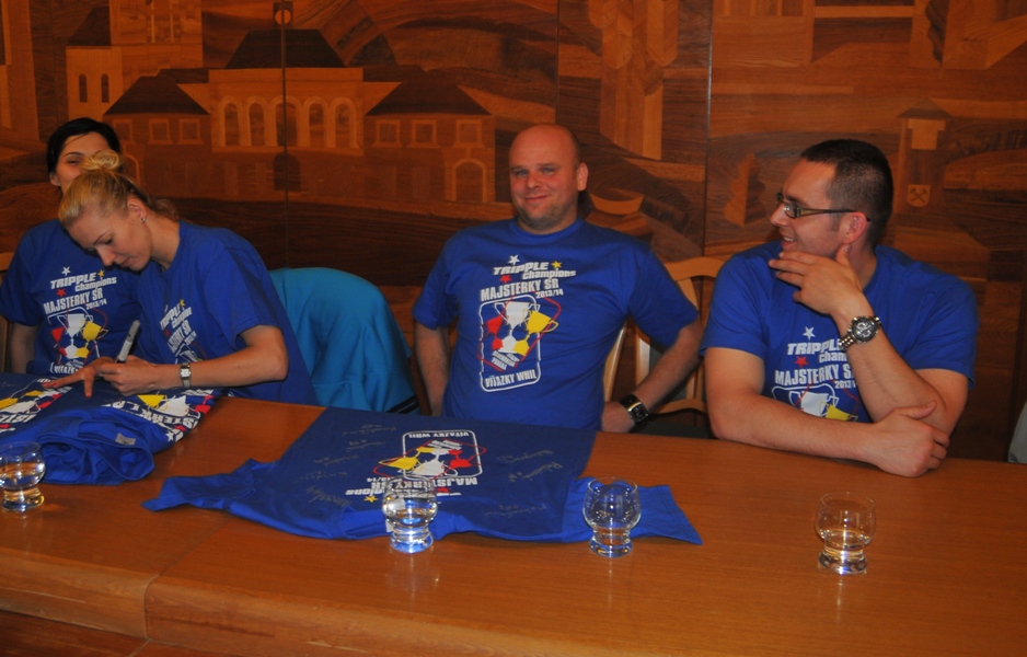 Svojou štipkou k diskusii prispel aj prezident klubu Gabriel Dorič, ktorý najskôr humorne uviedol, že Iuventu síce Šaľa vo finále národného play-off výrazne potrápila, no on sa tomu potešil, pretože chcel, aby sa titul konečne oslavoval na domácej pôde. Následne prezident žartom skonštatoval, že rozhodujúci piaty finálový duel absolvoval s hráčkami na palubovke aj on, keďže po finále mal možno spotenejšiu košeľu, ako mali hráčky dresy. Po nezáveznej debate prišlo ako vždy na podpis do pamätnej knihy mesta (tá už musí byť podpismi hráčok Iuventy zapísaná skoro celá...) a v závere sa primátor mesta s hádzanárkami a realizačným tímom spolu odfotografovali.