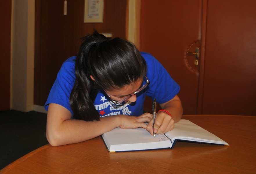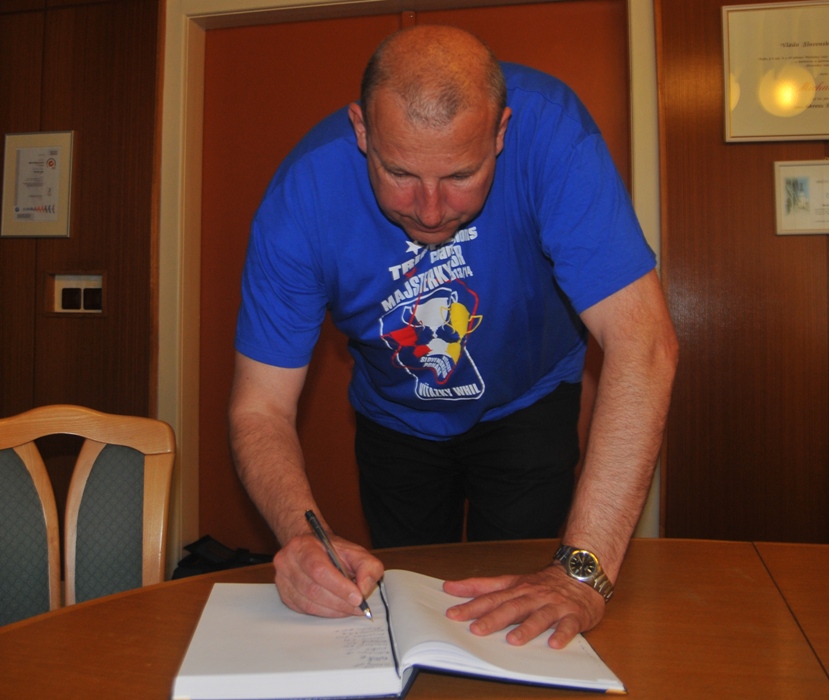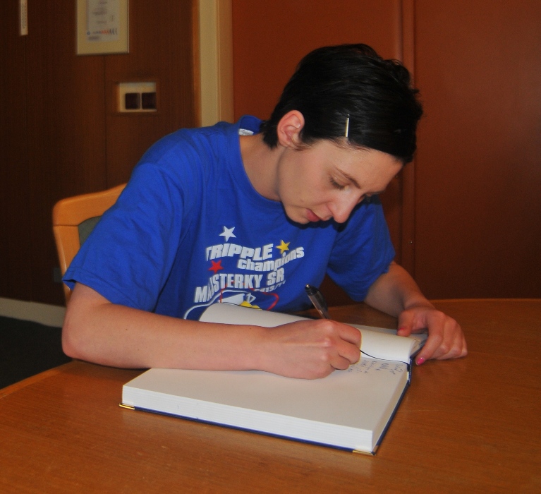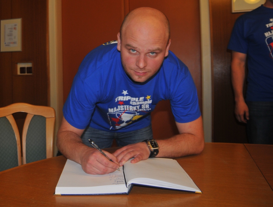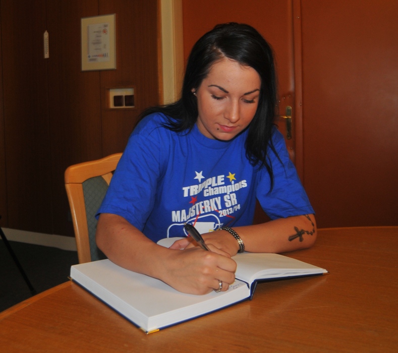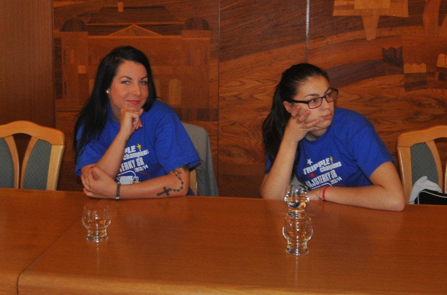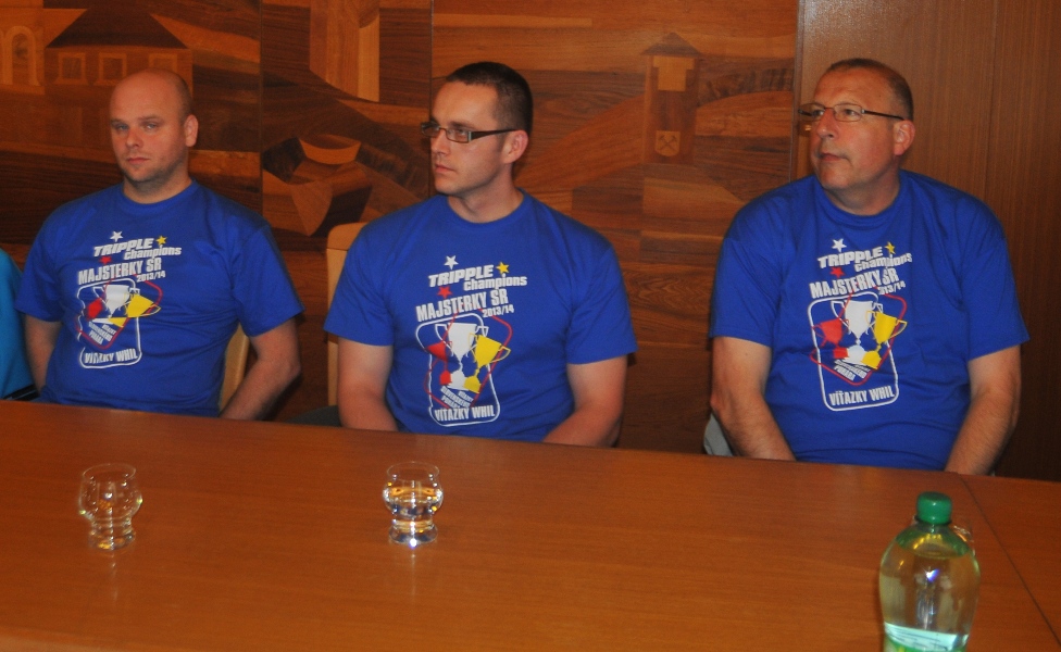 Svojou štipkou k diskusii prispel aj prezident klubu Gabriel Dorič, ktorý najskôr humorne uviedol, že Iuventu síce Šaľa vo finále národného play-off výrazne potrápila, no on sa tomu potešil, pretože chcel, aby sa titul konečne oslavoval na domácej pôde. Následne prezident žartom skonštatoval, že rozhodujúci piaty finálový duel absolvoval s hráčkami na palubovke aj on, keďže po finále mal možno spotenejšiu košeľu, ako mali hráčky dresy. Po nezáveznej debate prišlo ako vždy na podpis do pamätnej knihy mesta (tá už musí byť podpismi hráčok Iuventy zapísaná skoro celá...) a v závere sa primátor mesta s hádzanárkami a realizačným tímom spolu odfotografovali.
