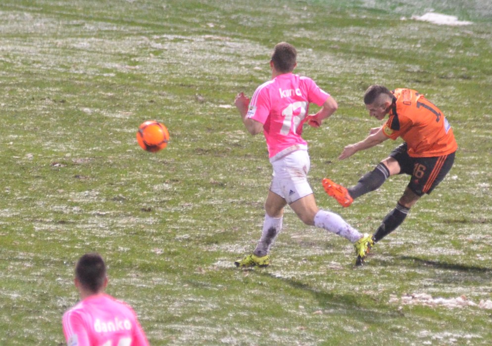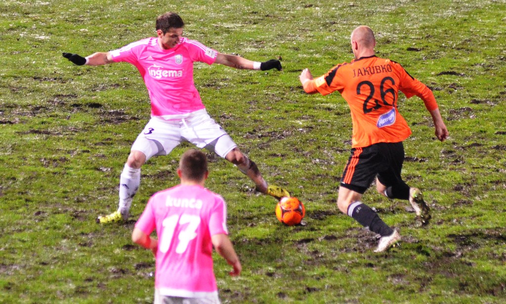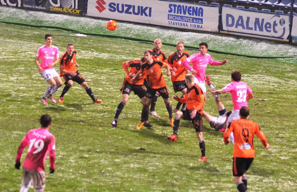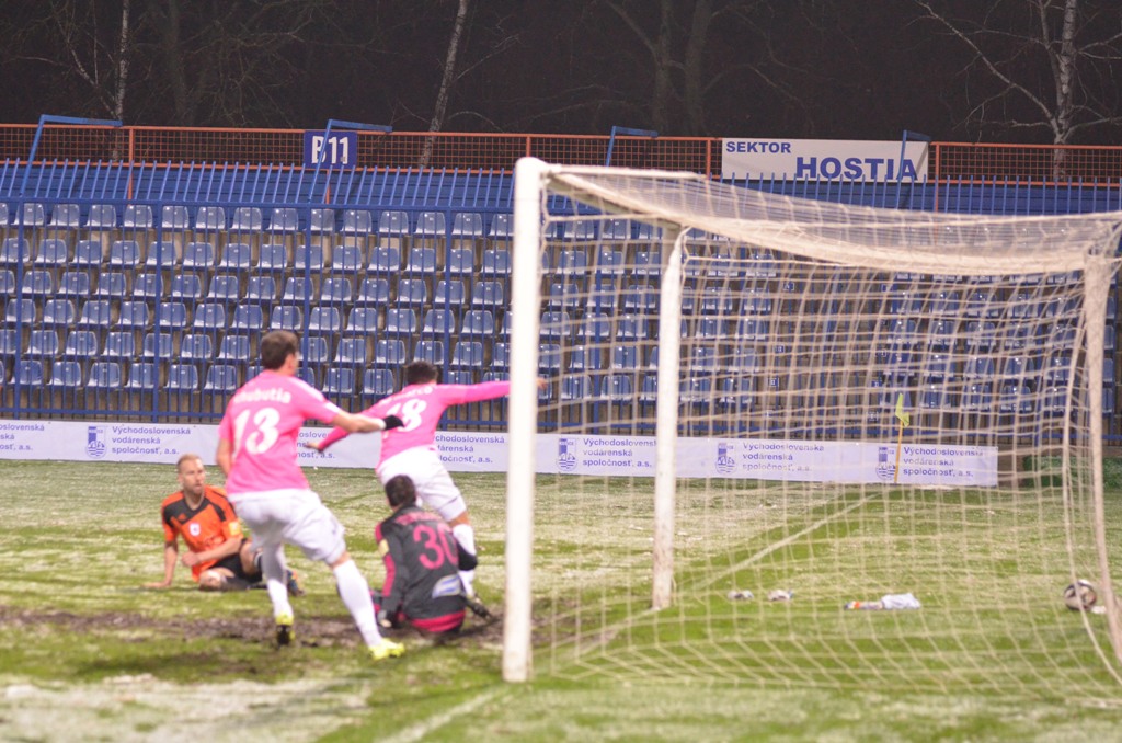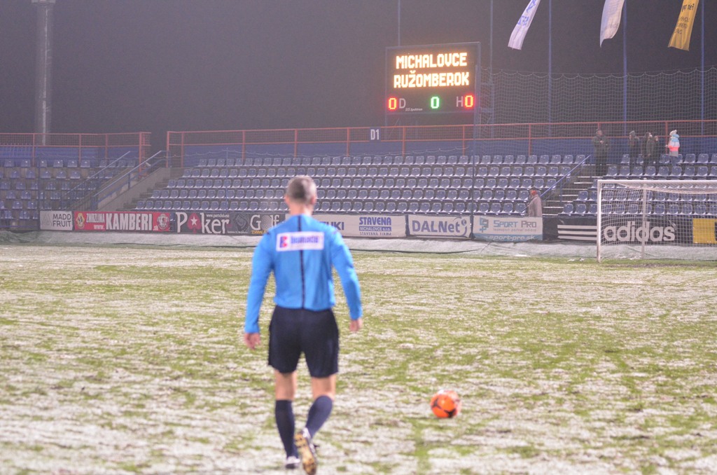 Nad Michalovcami sa pred začiatkom zápasu ženili asi všetci čerti a tak vyzeral pred úvodným výkopom aj trávnik. Terén po snehových prehánkach nebol najideálnejší a to vôbec nevyhovovalo kombinačnej hre domácich futbalistov. Tí však mali aj napriek tomu výborný vstup do zápasu a svoju prevahu pretavili v úvodný presný zásah. V siedmej minúte zahrával priamy kop Stanislav Danko, z ktorého centra Vernon de Marco najskôr mieril iba do brankára Tofiloského, no odrazenú loptu už španielsky legionár poslal do siete - 1:0. O päť minút neskôr mohlo byť už 2:0. Dominik Kunca ušiel po pravej strane následná strela Stanislava Danka ale nemala potrebnú razanciu a Darko Tofiloski s ňou nemal najmenšie problémy. Po dvadsiatich minútach nastalo na michalovskom štadióne dejavu spred troch týždňov, keď opäť vypadlo umelé osvetlenie a hráči sa tak pobrali do šatní. Po zhruba pol hodine nastala oprava a mohlo sa hrať opäť. Herný výpadok viac pomohol Ružomberčanom. Tí sa totiž postupne dostávali do hry čoraz viac. Mohli však dvakrát inkasovať. Najskôr tiesnený Dominik Kunca mieril iba do bočnej siete a potom strelu Akakiho Khubutiu zlikvidoval brankár Darko Tofiloski. Hostia gólové šance prečkali bez ujmy a v závere prvého dejstva udreli. V 41. minúte sa po pravej strane predral Štefan Zošák a jeho center poslal hlavou do siete Martin Boszorád - 1:1.