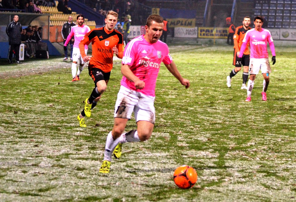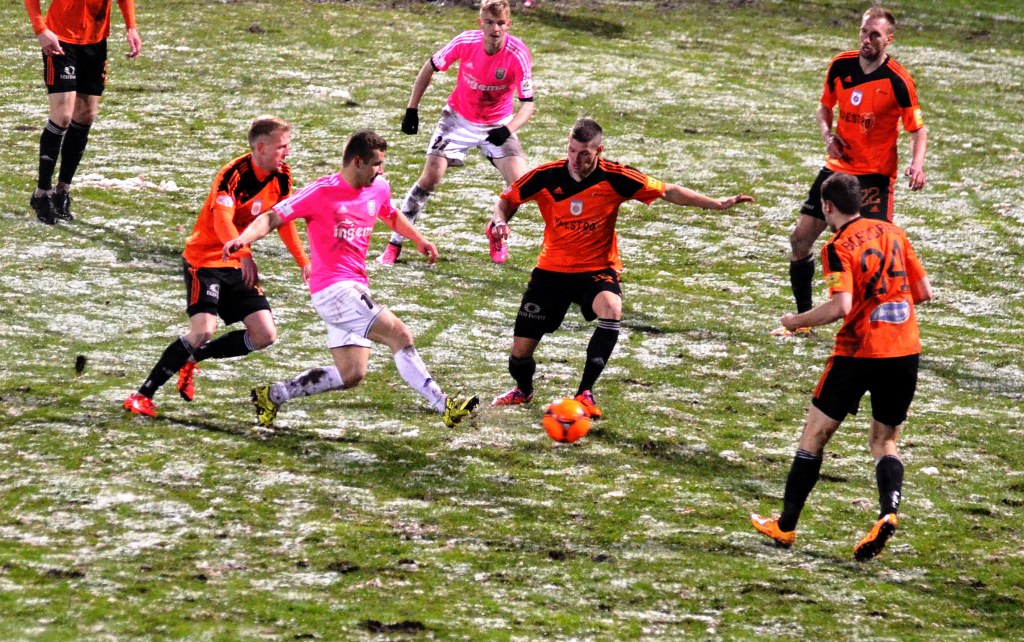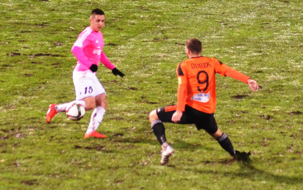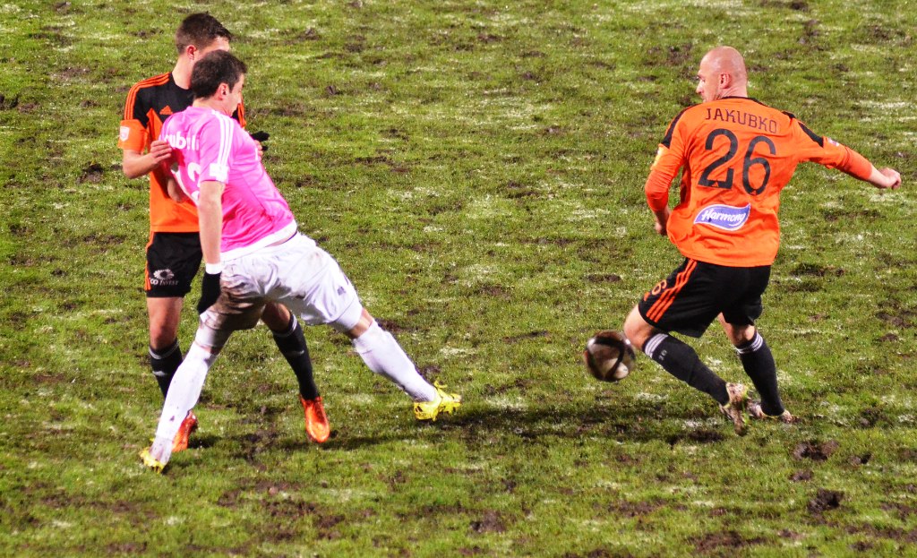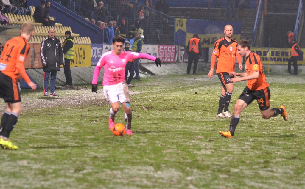 Nad Michalovcami sa pred začiatkom zápasu ženili asi všetci čerti a tak vyzeral pred úvodným výkopom aj trávnik. Terén po snehových prehánkach nebol najideálnejší a to vôbec nevyhovovalo kombinačnej hre domácich futbalistov. Tí však mali aj napriek tomu výborný vstup do zápasu a svoju prevahu pretavili v úvodný presný zásah. V siedmej minúte zahrával priamy kop Stanislav Danko, z ktorého centra Vernon de Marco najskôr mieril iba do brankára Tofiloského, no odrazenú loptu už španielsky legionár poslal do siete - 1:0. O päť minút neskôr mohlo byť už 2:0. Dominik Kunca ušiel po pravej strane následná strela Stanislava Danka ale nemala potrebnú razanciu a Darko Tofiloski s ňou nemal najmenšie problémy. Po dvadsiatich minútach nastalo na michalovskom štadióne dejavu spred troch týždňov, keď opäť vypadlo umelé osvetlenie a hráči sa tak pobrali do šatní. Po zhruba pol hodine nastala oprava a mohlo sa hrať opäť. Herný výpadok viac pomohol Ružomberčanom. Tí sa totiž postupne dostávali do hry čoraz viac. Mohli však dvakrát inkasovať. Najskôr tiesnený Dominik Kunca mieril iba do bočnej siete a potom strelu Akakiho Khubutiu zlikvidoval brankár Darko Tofiloski. Hostia gólové šance prečkali bez ujmy a v závere prvého dejstva udreli. V 41. minúte sa po pravej strane predral Štefan Zošák a jeho center poslal hlavou do siete Martin Boszorád - 1:1.