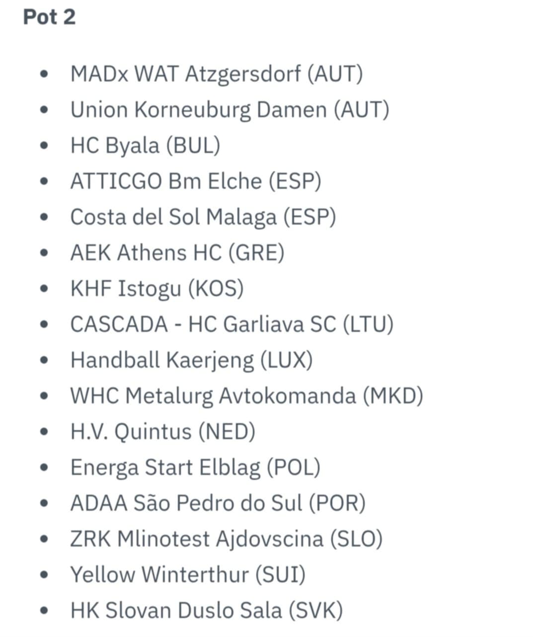 MŠK Iuventa Michalovce (Slovensko), A.C PAOK Solún (Grécko), AEK Atény (Grécko), ADAA Sao Pedro do Sul (Portugalsko), Atticgo BM Elche (Španielsko), Bursa Buyuksehir BSK (Turecko), Cabooter Fortes Venlo (Holandsko), Cascada HC Garliava SC (Litva), Club Balonmán Atlético Guardes (Španielsko), Costa del Sol Malaga (Španielsko), Energa Start Elblag (Poľsko), H.V Quintus (Holandsko), Handball Eric SSD ARL (Taliansko), Handball Kaerjeng (Luxembursko), Haukar (Island), Házená Kynžvart (Česká republika), HC Byala (Bulharsko), HC Gjorche Petrov WHC AD Skopje (Severné Macedónsko), HK Slovan Duslo Šaľa (Slovensko), Jomi Salerno (Taliansko), KHF Istogu (Kosovo), KPR Gminy Kobierzyce (Poľsko), Madeira Andebol SAD (Portugalsko), MADx WAT Atzgersdorf (Rakúsko), Replasa Beri-Onak(Španielsko), Union Korneuburg Damen (Rakúsko), Westfriesland SEW (Holandsko), WHC Metalurg Avtokomanda (Severné Macedónsko), Yellow Winterthur (Švajčiarsko), ZORK Bor (Srbsko), ZRK Mlinotest Ajdovščina (Slovinsko), ŽRK Split 2010 (Chorvátsko).