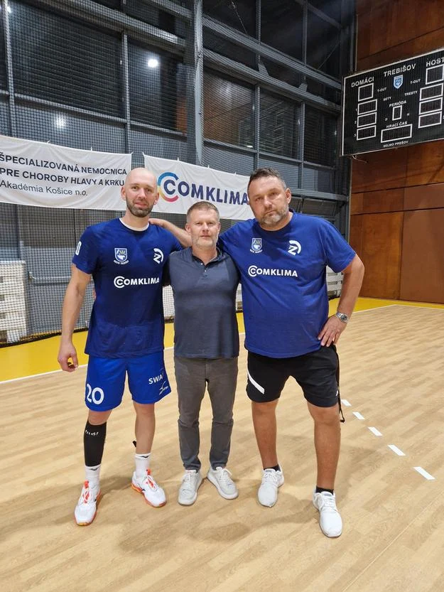 Tomáš Urban na spoločnej fotke s prezidentom klubu Ervínom Karvašom a trénerom mužského tímu Pavlom Janom, s ktorým sa stretol aj v sezóne 2011/12 v Michalovciach. (foto: šk zemplín trebišov).
